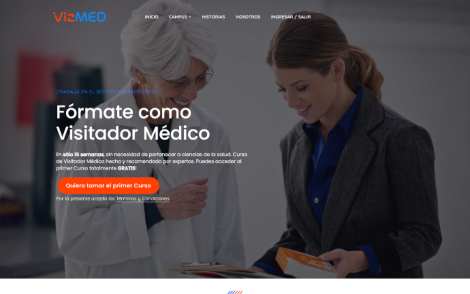 Si bien inicialmente la idea era proveer los cursos directamente desde Youtube, luego de una etapa de testeos, sugerimos cambios en el modelo de negocios, que incluyeron la creación de un Campus Virtual para dar acceso online al Curso de Visitador Médico a cada usuario, y que permitía contar con las funcionalidades de Cuestionarios de evaluación, puntajes y certificados de aprobación.